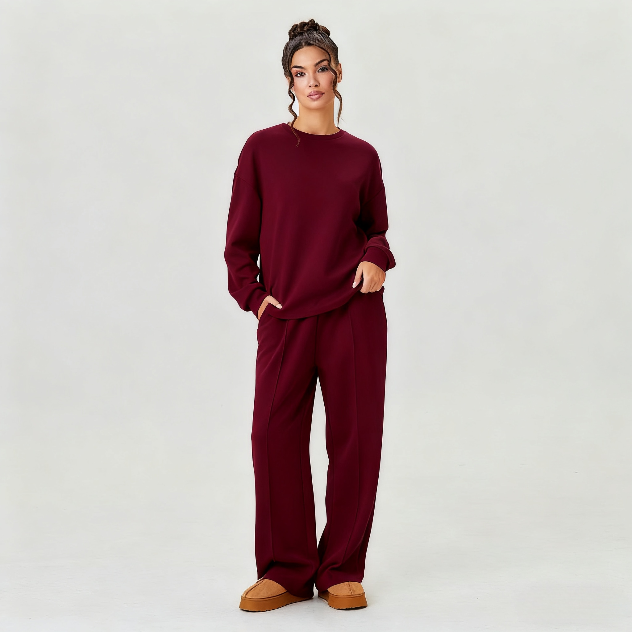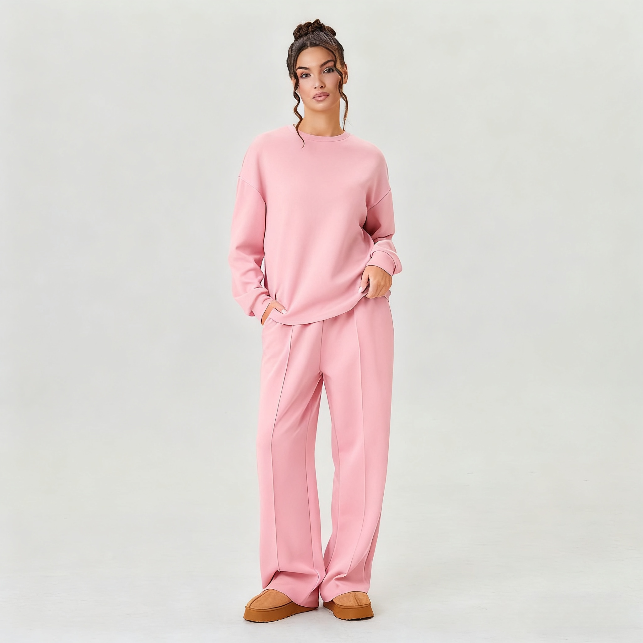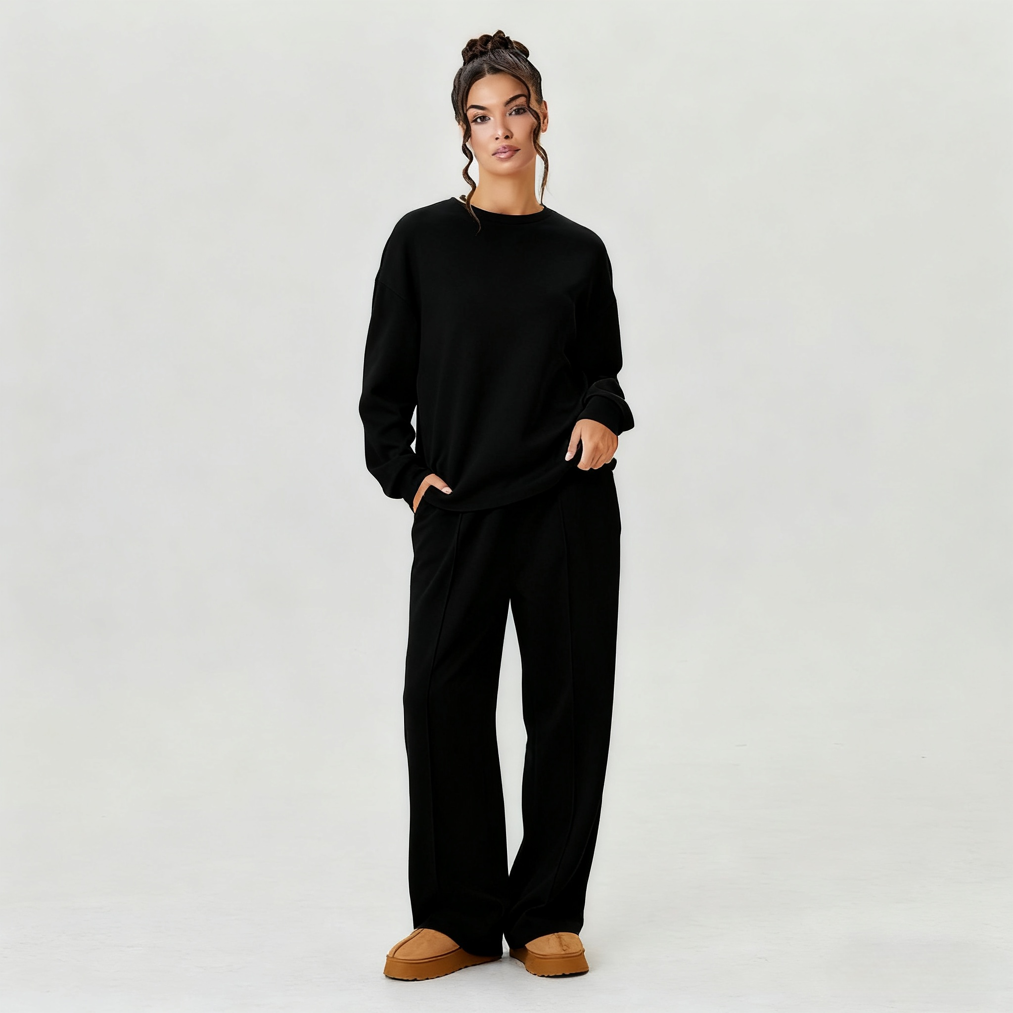 • Women's Casual Solid Color Loose Long Sleeve Top & Exposed Stitches Trousers Co-ord